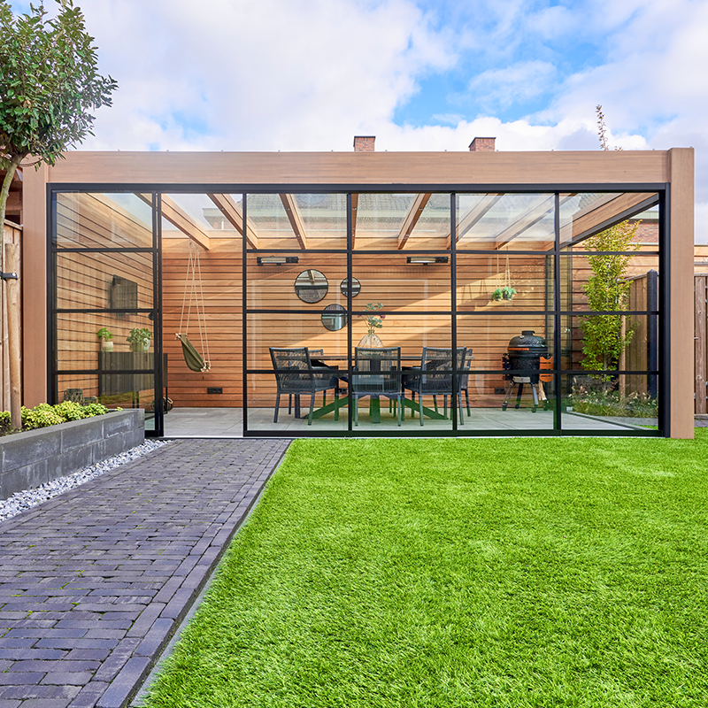 Dzięki przesuwnym szklanym ścianom VISTA możesz stworzyć przezroczystą barierę chroniącą przed wiatrem i deszczem, nie ograniczając widoczności. Te przesuwne ściany to idealne uzupełnienie zadaszenia tarasu, werandy lub szopy ogrodowej.